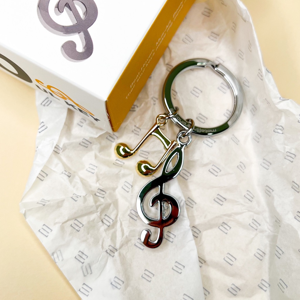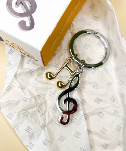 Celebra la tua passione per la musica con questo elegante portachiavi, decorato con una chiave di violino e una nota musicale.